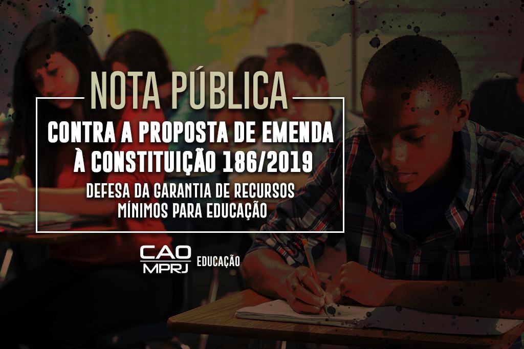 O Ministério Público do Estado do Rio de Janeiro (MPRJ), por meio do Centro de Apoio Operacional das Promotorias de Justiça de Tutela Coletiva de Proteção à Educação (CAO Educação/MPRJ), se manifestou, nesta quarta-feira (24/02), contrariamente à alteração na Proposta de Emenda à Constituição (PEC 186/2019), que retira os pisos para investimento em Educação e Saúde, e deve ser votada nesta quinta-feira (25/2), no Senado Federal. A manifestação ocorreu em Nota Pública enviada a deputados federais e senadores, cujo teor foi elaborado pelo Grupo Nacional de Direitos Humanos (GNDH) do Colégio Nacional de Procuradores-Gerais (CNPG), por meio da Comissão Permanente de Educação (COPEDUC), da qual o CAO Educação/MPRJ faz parte, juntamente com outros Ministérios Públicos dos Estados e do DF. Também assinam a 1ª Câmara de Coordenação e Revisão do Ministério Público Federal (1ª CCR/MPF) e a Procuradoria Federal dos Direitos do Cidadão (PFDC/MPF).