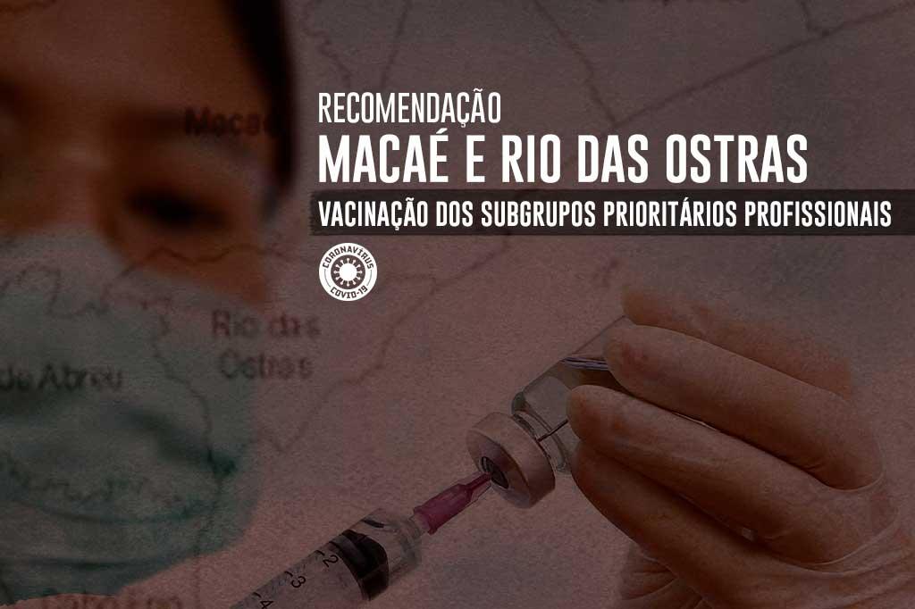 O Ministério Público do Estado do Rio de Janeiro (MPRJ), por meio da 1ª Promotoria de Justiça de Tutela Coletiva do Núcleo Macaé, expediu, na quinta-feira (06/05), Recomendação aos prefeitos e secretários de Saúde dos Municípios de Macaé e Rio das Ostras para que seja suspensa a antecipação da vacinação dos subgrupos prioritários profissionais, enquanto não forem finalizados os grupos de pessoas idosas, pessoas com deficiência e pessoas com comorbidades graves, na forma preconizada pelo Plano Nacional de Operacionalização contra Covid-19, do Ministério da Saúde (MS).