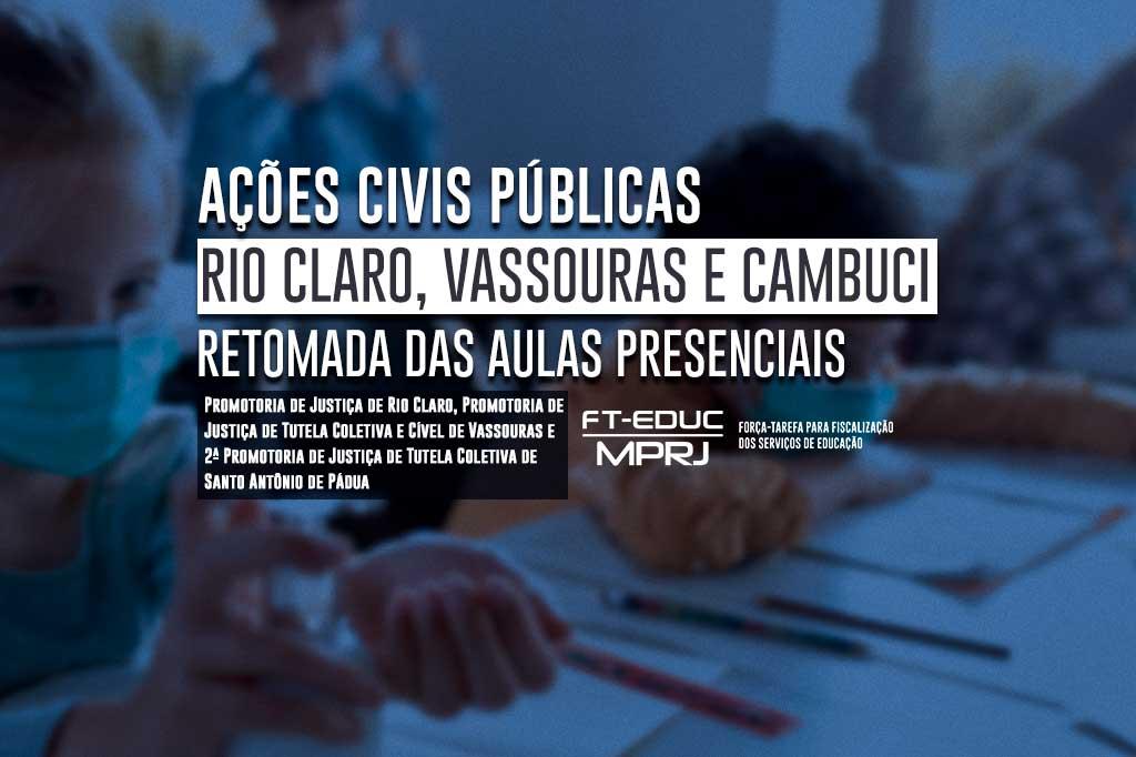 O Ministério Público do Estado do Rio de Janeiro (MPRJ), por meio da Força-Tarefa de Educação (FT-Educação/MPRJ), em auxílio à Promotoria de Justiça de Rio Claro, à Promotoria de Justiça de Tutela Coletiva do Núcleo Vassouras, à Promotoria de Justiça Cível de Vassouras e à 2ª Promotoria de Justiça de Tutela Coletiva de Santo Antônio de Pádua, ajuizou três ações civis públicas em face dos Municípios de Rio Claro, Vassouras e Cambuci. As ações requerem que as administrações municipais promovam de forma gradual a volta às aulas presenciais ou, ao menos, de maneira híbrida (atividades presenciais e remotas), no sistema público de ensino, indicando a bandeira sanitária adequada para esse funcionamento presencial e providenciando as condições sanitárias necessárias para que o retorno ocorra de forma segura.