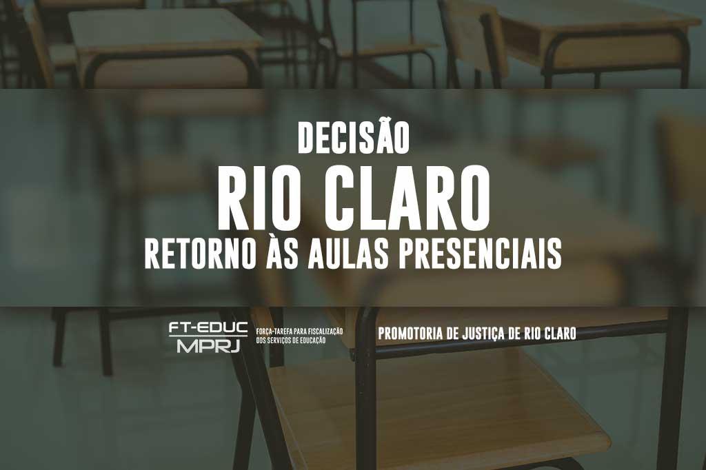 O Ministério Público do Estado do Rio de Janeiro (MPRJ), por meio da Força-Tarefa de Educação (FT-Educação/MPRJ), em auxílio à Promotoria de Justiça de Rio Claro, obteve decisão determinando que o Município retome, em prazo máximo de 30 dias, aulas presenciais ou de forma híbrida (atividades presenciais e remotas), no serviço público educacional. A decisão atende aos pedidos de uma ação civil pública ajuizada para que a administração municipal promova o retorno às aulas indicando a bandeira sanitária adequada e providenciando as condições sanitárias necessárias para que o retorno se dê de forma segura.
