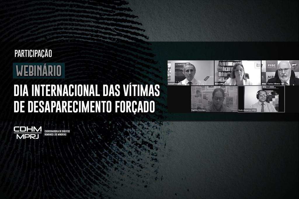 O Ministério Público do Estado do Rio de Janeiro (MPRJ), por meio da Coordenadoria de Direitos Humanos e Minorias (CDHM/MPRJ), participou, nesta segunda-feira (30/08), do webinário em homenagem ao Dia Internacional das Vítimas de Desaparecimento Forçado, promovido pela Procuradoria Federal dos Direitos do Cidadão (PFDC), estrutura do Ministério Público Federal (MPF). O evento, transmitido pelo Canal do MPF no Youtube, ocorre no âmbito do projeto Encontros da Cidadania, sendo realizado desta vez com apoio do Grupo de Trabalho (GT) Memória e Verdade da PFDC.