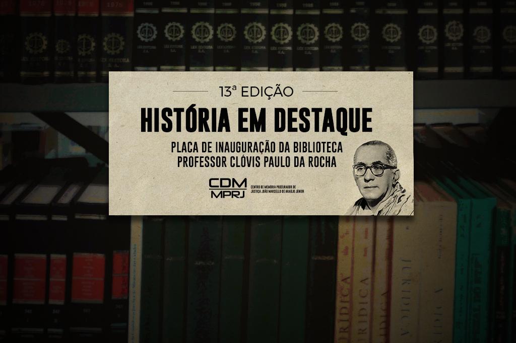 O Ministério Público do Estado do Rio de Janeiro (MPRJ), por meio do Centro de Memória Procurador de Justiça João Marcello de Araújo Júnior (CDM/MPRJ), apresenta, na 13ª edição do projeto História em Destaque, a placa de inauguração da biblioteca da Associação do MPRJ (AMPERJ), inicialmente chamada de Biblioteca Professor Clóvis Paulo da Rocha. Posteriormente integrada à estrutura do MPRJ, passou a se denominar Biblioteca Procurador-Geral de Justiça Clóvis Paulo da Rocha.