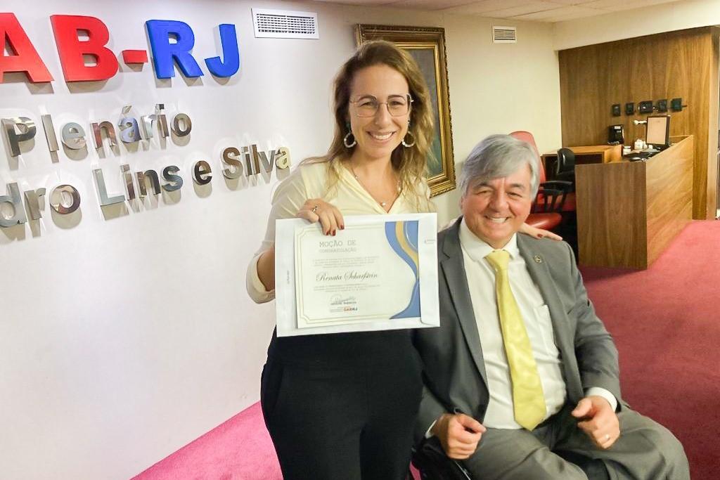 A coordenadora do Centro de Apoio Operacional das Promotorias de Justiça Cíveis e de Tutela Coletiva da Pessoa com Deficiência (CAO Cível e Pessoa com Deficiência/MPRJ), promotora de Justiça Renata Scharfstein, recebeu da Comissão de Direitos da Pessoa com Deficiência (CDPD) da Ordem dos Advogados do Brasil (OAB-RJ) moção de congratulação pelos relevantes serviços prestados em prol da causa das pessoas com deficiência do Rio de Janeiro. A homenagem ocorreu na terça-feira (05/04), durante cerimônia do evento “Incluir é Garantir”, da OAB-RJ.