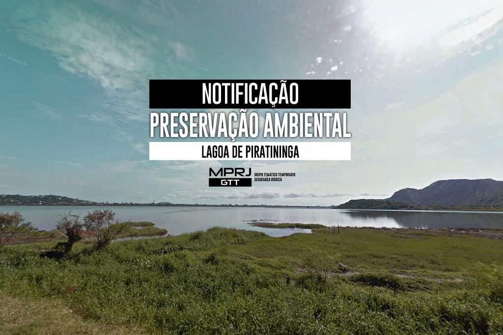 O Ministério Público do Estado do Rio de Janeiro (MPRJ), por meio do Grupo Temático Temporário para Garantia de Segurança Hídrica (GTT Segurança Hídrica/MPRJ), expediu notificação com recomendação, para que órgãos e entidades do município de Niterói e o Instituto Estadual do Ambiente (INEA) adotem medidas de sustentabilidade e melhoria ambiental em prol da Lagoa de Piratininga, na Região Oceânica. As determinações foram feitas depois de uma vistoria do Grupo de Apoio Técnico Especializado (GATE/MPRJ), no início de fevereiro, onde foram visitados, entre outros locais, o Canal do Camboatá na vertente da Lagoa de Piratininga, a saída do Túnel do Tibau, a Estação de Tratamento de Esgoto de Camboinhas e a Estação Elevatória de Esgoto situada na Praça do Descobrimento.