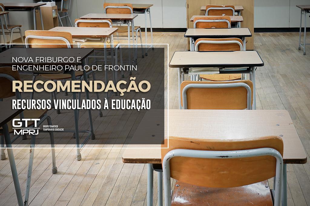O Grupo Temático Temporário de Educação do Ministério Público do Estado do Rio de Janeiro (GTT-Educação/MPRJ) expediu recomendação para que os municípios de Nova Friburgo e Engenheiro Paulo de Frontin abram conta bancária específica para os recursos públicos vinculados à Educação. O objetivo é garantir a correta destinação dos repasses de verbas referentes ao mínimo constitucional, aos royalties da educação, ao Fundeb e do Salário-Educação, sem possibilidade de transferência para outras contas do tesouro municipal.