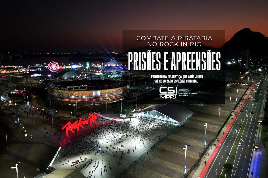 O Ministério Público do Estado do Rio de Janeiro (MPRJ), por meio da Promotoria de Justiça que atua junto ao IX Juizado Especial Criminal, com apoio da Coordenadoria de Segurança e Inteligência (CSI/MPRJ), prendeu 7 pessoas e apreendeu produtos falsificados no primeiro fim de semana do festival Rock In Rio. O trabalho preventivo consolidado de combate à pirataria e proteção à marca do evento Rock in Rio foi eficaz para reduzir o número de apreensões este ano. Uma das novidades na fiscalização foi a utilização de um drone por agentes da CSI/MPRJ. Os trabalhos foram realizados em conjunto com o Serviço Reservado do 31º BPM (Recreio dos Bandeirantes).