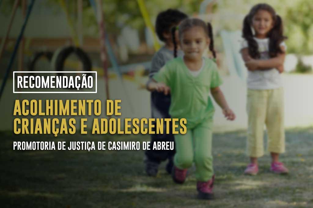 O Ministério Público do Estado do Rio de Janeiro (MPRJ), pela Promotoria de Justiça de Casimiro de Abreu, expediu recomendação para que o Município de Casimiro de Abreu adote providências para adequação do serviço de acolhimento de crianças e adolescentes. Vistoria realizada pelo Grupo de Apoio Técnico Especializado (GATE/MPRJ) constatou graves problemas de infraestrutura e desrespeito aos parâmetros legais e aos marcos normativos de referência para o funcionamento de instituições de acolhimentos. O relatório do GATE/MPRJ avaliou a conservação e instalações prediais, a acessibilidade, os serviços e projetos socioassistenciais, entre outras questões.