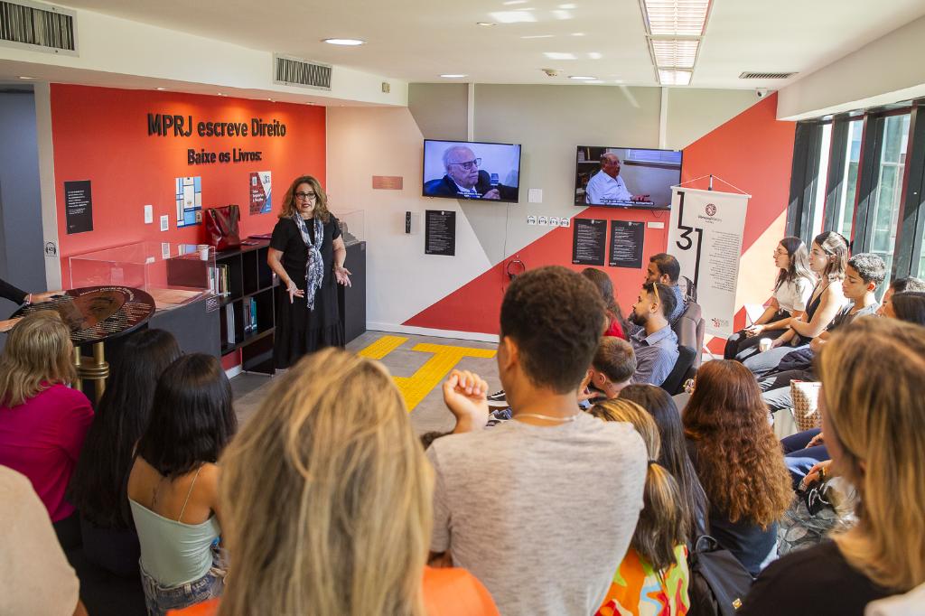 O Ministério Público do Estado do Rio de Janeiro (MPRJ), por meio do Centro de Memória Procurador de Justiça João Marcello de Araújo Júnior (CDM/MPRJ), recebeu, nesta segunda-feira (06/05), estudantes de Direito da Universidade Universidade Candido Mendes para uma visita à exposição "131 anos do Ministério Público no Rio de Janeiro". Ao todo, 30 25 alunos tiveram a oportunidade de conhecer a atuação ministerial e aprender sobre a história do MPRJ.