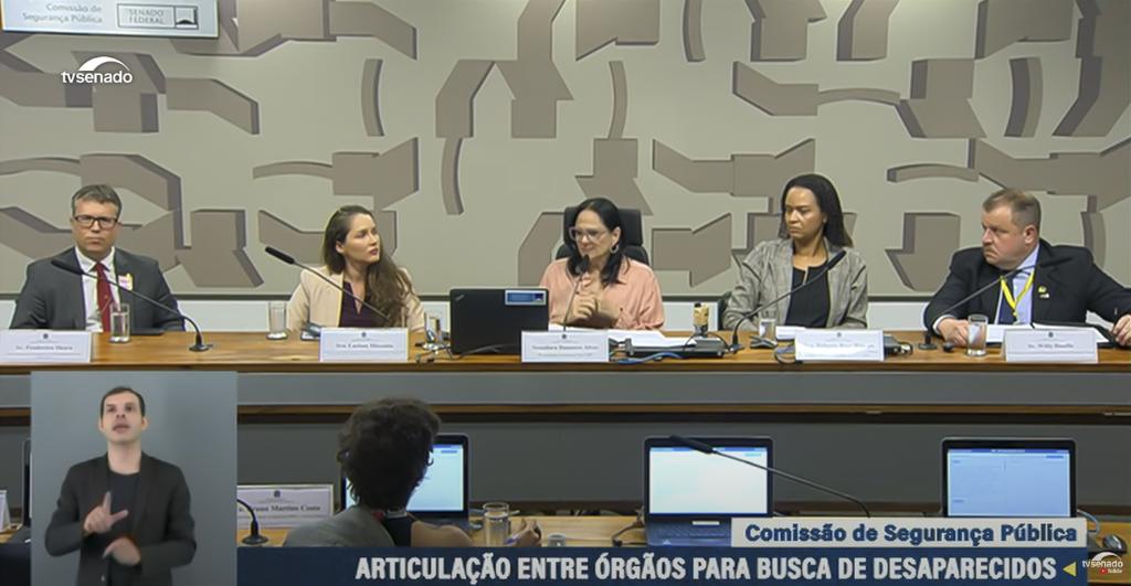 Na audiência foram debatidos temas como avaliação dos programas de inteligência e articulação entre órgãos de segurança pública e demais órgãos públicos na investigação das circunstâncias de pessoas desaparecidas, o apoio e empenho do poder público à pesquisa e ao desenvolvimento científico e tecnológico voltados às análises que contribuam para a elucidação dos casos de desaparecimento e a capacitação permanente dos agentes públicos.