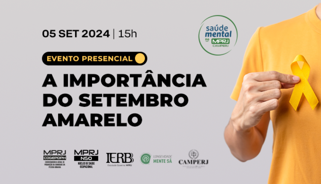 O Ministério Público do Estado do Rio de Janeiro (MPRJ) reunirá, nesta quinta-feira (05/09), especialistas em saúde mental no evento “A importância do Setembro Amarelo”, às 15h, no auditório do edifício-sede do MPRJ. A palestra, que integra os trabalhos do projeto Saúde Mental no MPRJ, tem por objetivo destacar a importância da prevenção do suicídio, que nos últimos anos registrou aumento de casos no Brasil. O evento é promovido pela Subprocuradoria-Geral de Justiça de Administração, pelo Núcleo de Saúde Ocupacional (NSO/MPRJ) e a Caixa de Assistência do MPRJ (Camperj).