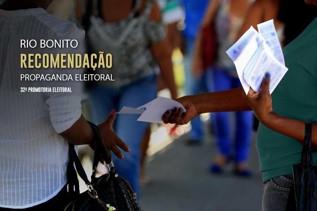 O Ministério Público Eleitoral (MPE), por meio da 32ª Promotoria Eleitoral, encaminhou, nesta terça-feira (01/10), às direções das coligações partidárias e partidos políticos não coligados atuantes no Município de Rio Bonito, uma Recomendação para que, conforme determina a legislação eleitoral, não seja distribuído material de campanha nas ruas da cidade após o fim do prazo de propaganda eleitoral, às 22 horas do sábado (05/10), véspera das eleições municipais.