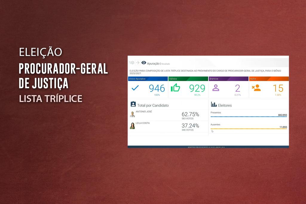 Com 583 votos (62,75%), o procurador de Justiça Antonio José Campos Moreira foi o candidato mais votado na eleição realizada nesta segunda-feira (02/12), que definiu a composição da lista tríplice para a escolha do procurador-geral de Justiça do Rio de Janeiro no biênio 2025-2027. A procuradora de Justiça Leila Machado Costa recebeu 346 votos (37,24%) e completa a relação. A lista com os dois nomes será entregue ao governador do Estado, no dia 1ª de janeiro de 2025, para nomeação. O escolhido exercerá mandato de dois anos, entre 17 de janeiro de 2025 e 16 de janeiro de 2027.