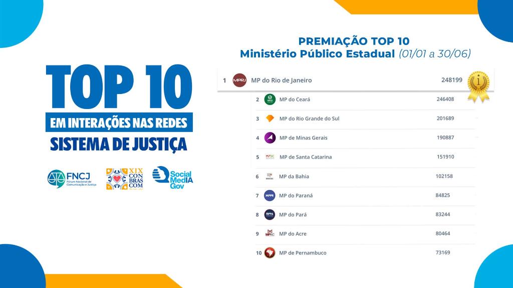 Durante a programação do XIX Congresso Brasileiro dos Assessores de Comunicação do Sistema de Justiça 2025 (CONBRASCOM), realizado em São Luís, no Maranhão, o Ministério Público do Estado do Rio de Janeiro (MPRJ) recebeu o prêmio “Top 10 em Interações nas Redes – Sistema de Justiça”, concedido pela plataforma Social Media Gov, especializada em comunicação pública. No levantamento referente ao primeiro semestre de 2025, o MPRJ conquistou o 1º lugar entre todos os Ministérios Públicos estaduais no ranking de instituições com maior interação com a população nas redes sociais.