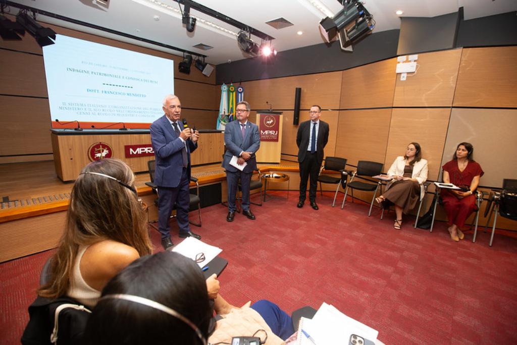 O Ministério Público do Estado do Rio de Janeiro (MPRJ), por meio da Assessoria Internacional e do Instituto de Educação Roberto Bernardes Barroso (IERBB/MPRJ), promoveu, nesta segunda-feira (29/09), a abertura do workshop “Investigação Patrimonial e Confisco de Bens”, que contou com a participação do procurador da República italiano Francesco Menditto e do coronel da Guardia di Finanza, Stefano Pignoloni. A Guardia é uma força militar especializada em crimes financeiros, com competências para combater o terrorismo, o tráfico de drogas e de armas, além de realizar investigações sobre fraudes fiscais, contrabando e lavagem de dinheiro. O evento, realizado no Auditório Vera Leite, tem duração de quatro dias.