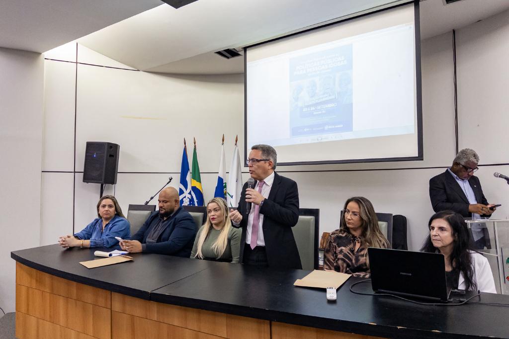A mesa de abertura do evento contou com a presença do procurador-geral de Justiça Antonio José Campos Moreira, do promotor de Justiça Leandro Navega, Diretor do IERBB, do promotor de Justiça Luiz Cláudio Carvalho de Almeida, coordenador do Centro de Apoio Operacional das Promotorias de Justiça da Pessoa Idosa (CAO Idoso/MPRJ) e de Sandra Rabello de Frias, coordenadora de extensão do Núcleo de Estudos sobre o Envelhecimento Humano (NucEH/UERJ). Os participantes da mesa ressaltaram a necessidade de eventos de capacitação contínuos como este voltados para os profissionais da rede de cuidados com a pessoa idosa, em alinhamento com o compromisso ministerial na proteção e fiscalização dos direitos da população idosa.