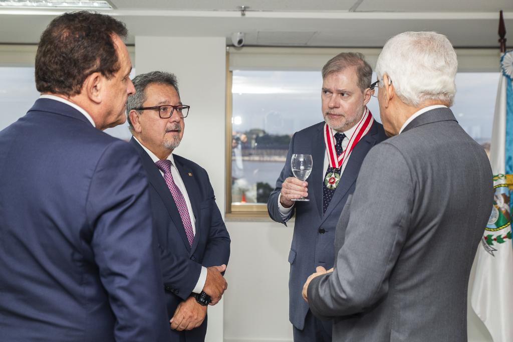 O ministro do Supremo Tribunal Federal Dias Toffoli recebeu, nesta segunda-feira (08/12), o Colar do Mérito do Ministério Público do Estado do Rio de Janeiro (MPRJ), maior honraria concedida pela instituição. A entrega foi antecipada, uma vez que o ministro não poderá comparecer à solenidade oficial de outorga do colar, marcada para o dia 15 de dezembro. O procurador-geral de Justiça, Antonio José Campos Moreira, realizou a entrega da comenda.
