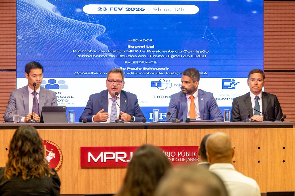 A mesa de abertura foi composta pelos promotores de Justiça Alexandre Joppert, vice-diretor do IERBB/MPRJ; Sauvei Lai, mediador do evento e presidente da Comissão Permanente de Estudos em Direito Digital; e Pedro Borges Mourão, conselheiro da Comissão de Direito Digital, sendo ambas as comissões vinculadas ao Instituto de Educação.