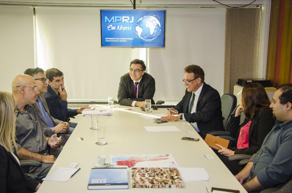 O procurador-geral de Justiça do Estado do Rio de Janeiro, Eduardo Gussem, e o subprocurador-geral de Justiça de Administração, Eduardo Lima Neto, apresentaram a plataforma digital “MP em Mapas" a representantes da Universidade do Estado do Rio de Janeiro (UERJ). O encontro, que aconteceu nesta quarta-feira (26/07), reuniu o sub-reitor de Pós-graduação e Pesquisa da UERJ, Egberto Gaspar de Moura, e os coordenadores de Análise da Violência, professores Ignácio Cano e João Trajano Santo-Sé.