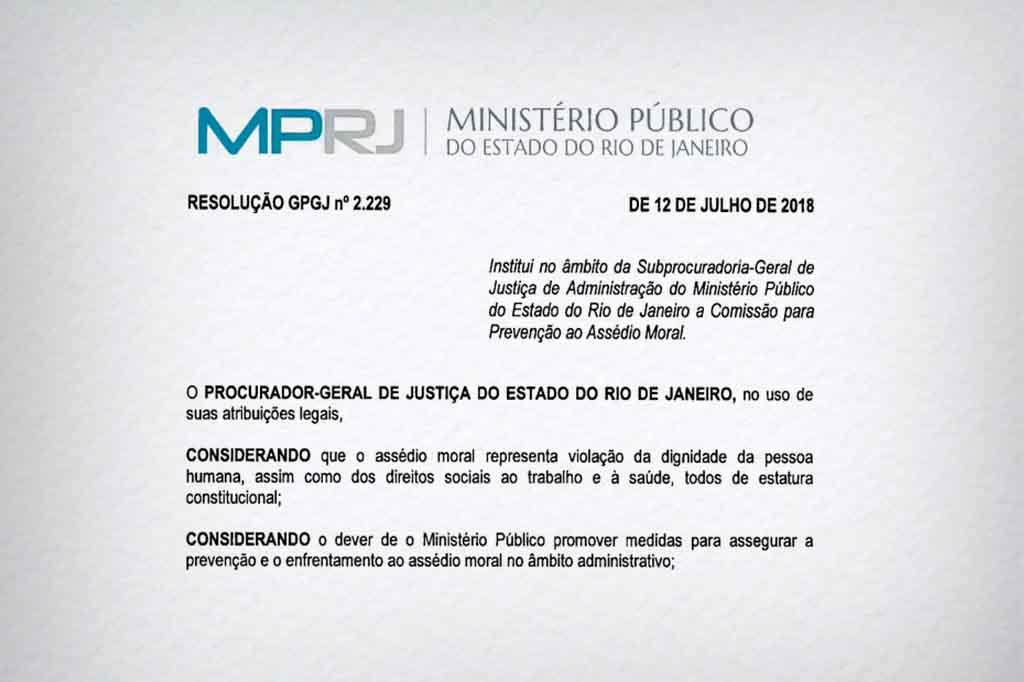O procurador-geral de Justiça do Estado do Rio de Janeiro, Eduardo Gussem, assinou resolução que institui a Comissão para Prevenção ao Assédio Moral, no Ministério Público do Rio de Janeiro (MPRJ). Publicada nesta segunda-feira (16/07), a resolução foi instituída no âmbito da Subprocuradoria-Geral de Justiça de Administração.