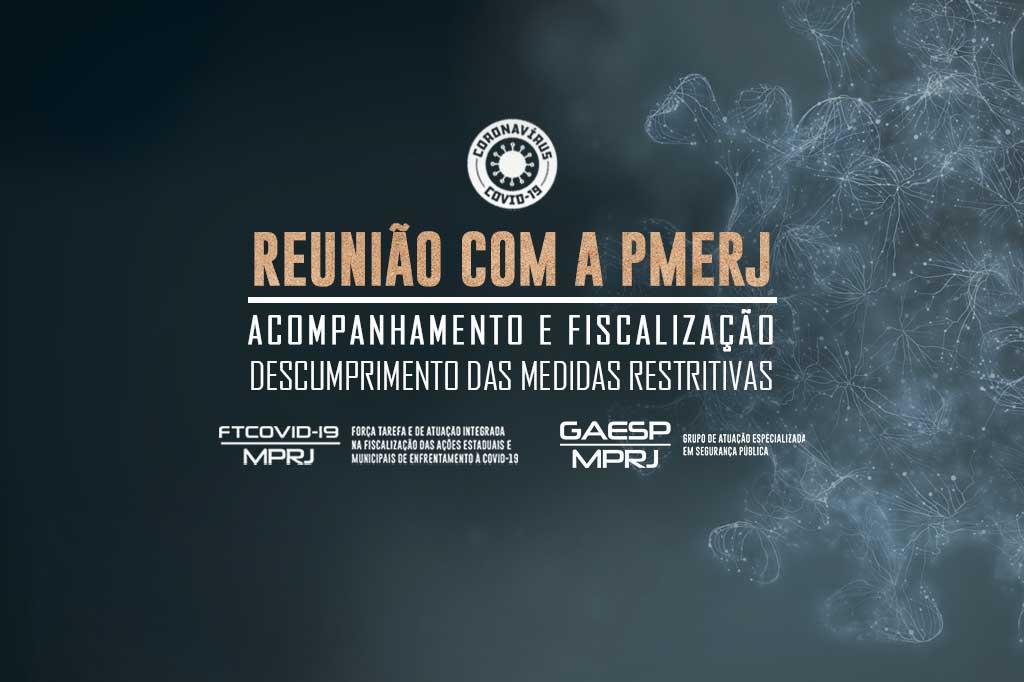 As reuniões com a PMERJ vêm sendo realizadas pela FTCOVID-19/MPRJ, GAESP/MPRJ e 3ª PJTC Cidadania, tendo em vista o acompanhamento do cumprimento das ações previstas no Protocolo, que descreve incumbências de cada órgão no que se refere a ações a manifestações e carreatas, entre outros itens.